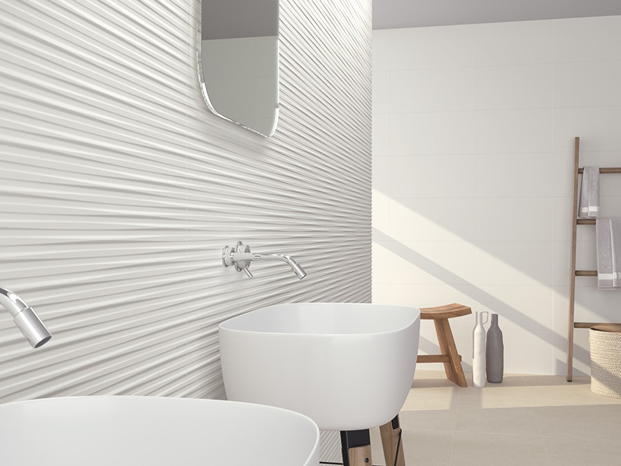 Hay colecciones de azulejos para baño de color blanco que aportan otras ventajas. Por ejemplo, la colección Ona Blanco no solo son piezas de revestimiento cerámico para baño de 30×60 cm que ofrecen una colocación muy sencilla y un acabado muy atractivo. Los azulejos con relieve aporta a la imagen final un añadido agradable y bien acabado.