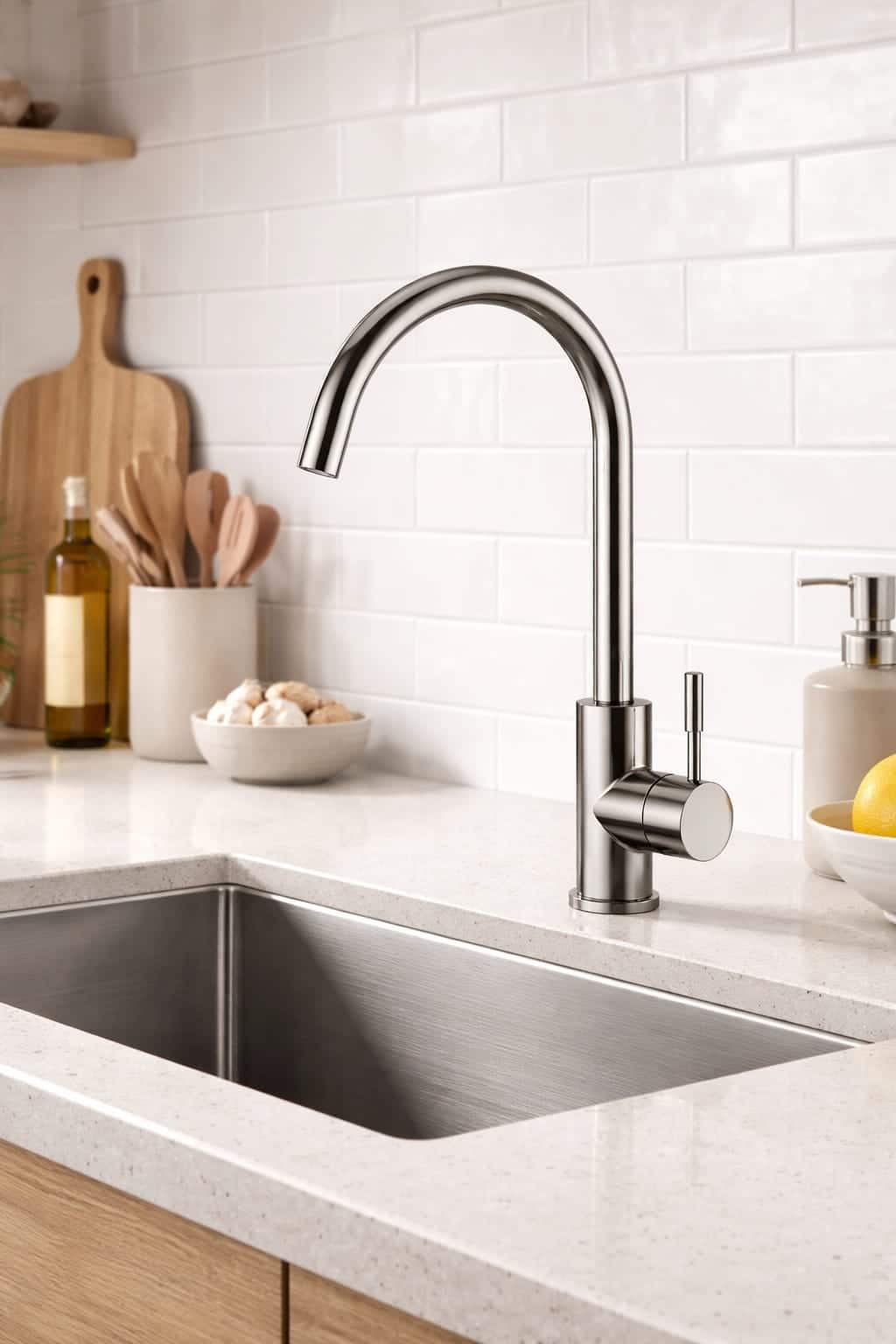 El grifo de cocina Lyon en acabado níquel combina un diseño elegante y atemporal con una alta funcionalidad, siendo una opción ideal para cocinas modernas y contemporáneas. Su acabado níquel aporta luminosidad y sofisticación, integrándose fácilmente en todo tipo de estilos, desde cocinas minimalistas hasta ambientes más clásicos.